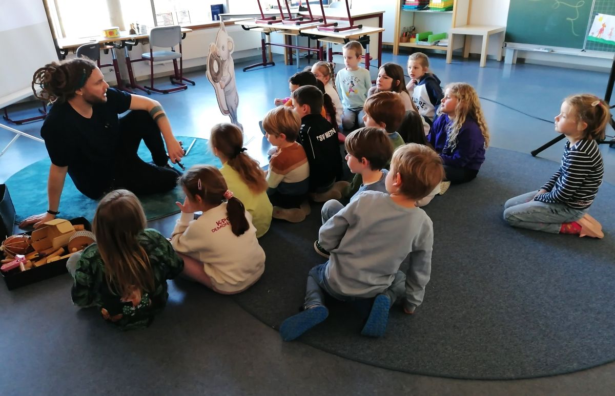 Der Kinderbuchautor und Musiker Andy Kuhn besuchte an zwei Tagen unsere FleGs-Klassen und erzählte die Geschichte von dem mutigen und schlauen Mäuserich Lomäus Barthaar. Es geht darin um anders sein und um die Gemeinschaft in dem kleinen Ort Maushausen.